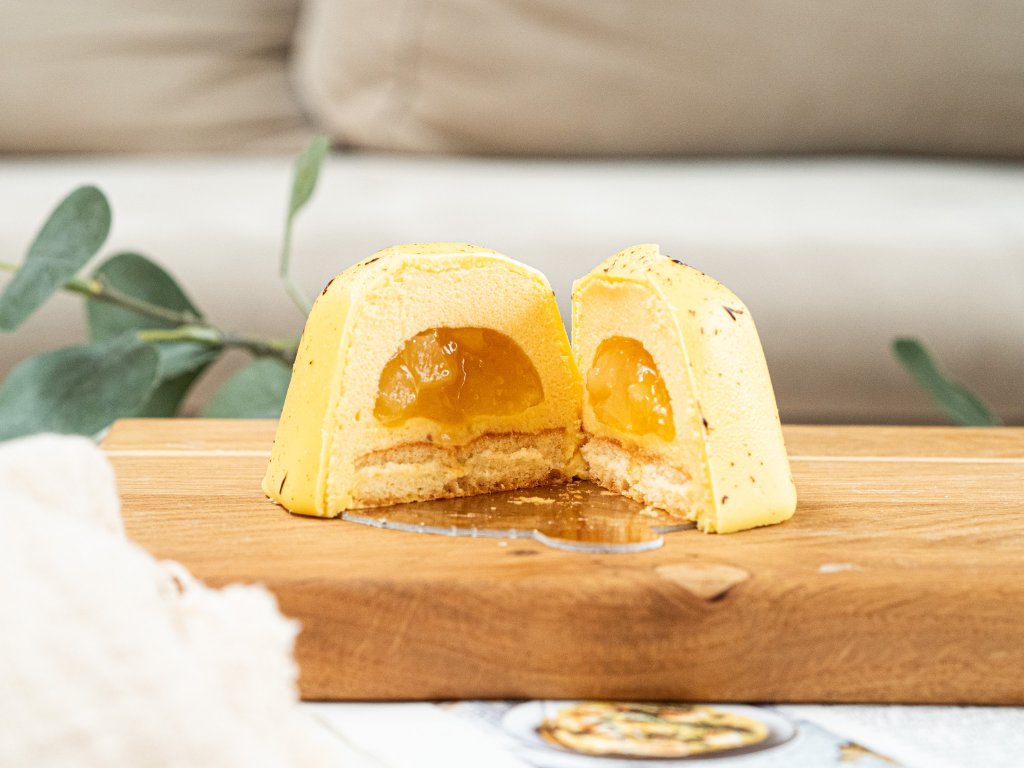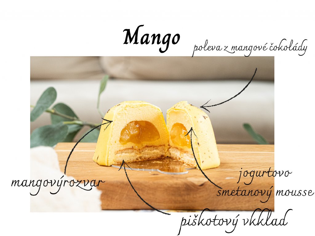 | Složení: | mangový rozvar, jogurtovo smetanový mousse, poleva z mangové čokolády |